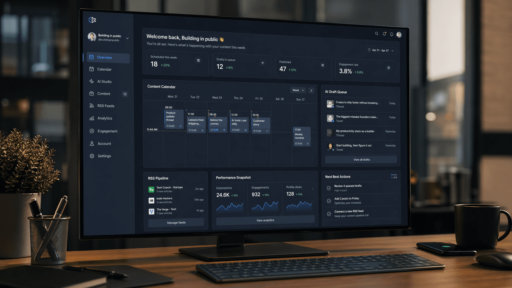 Shippost turns ideas, RSS feeds, and AI prompts into scheduled posts with a dashboard built for creators, founders, and teams publishing on X.